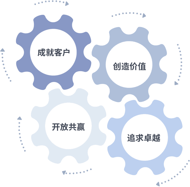 成就客户是一切决策的出发点,,,,创造价值是衡量所有工作的标准,,追求卓越是我们做事做人的态度,,开放共赢是我们的格局也是最终的结果。。价值观的齿轮环环相扣,,,推动着组织里的每个人不断向前。。。